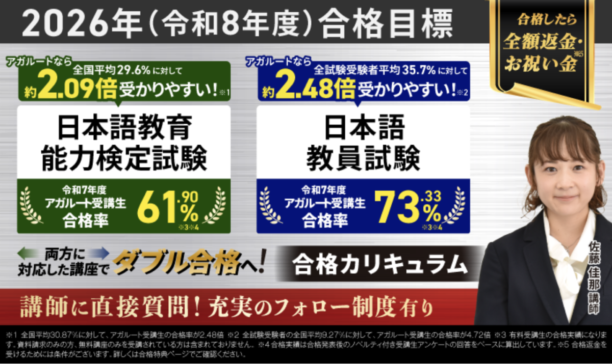 日本語教育能力検定試験は、国内の日本語学校(法務省告示校)で日本語教師として働くための要件の1つであり、合格すれば就職の幅も広がるため、日本語教師をめざす人なら誰もが合格したい試験です。